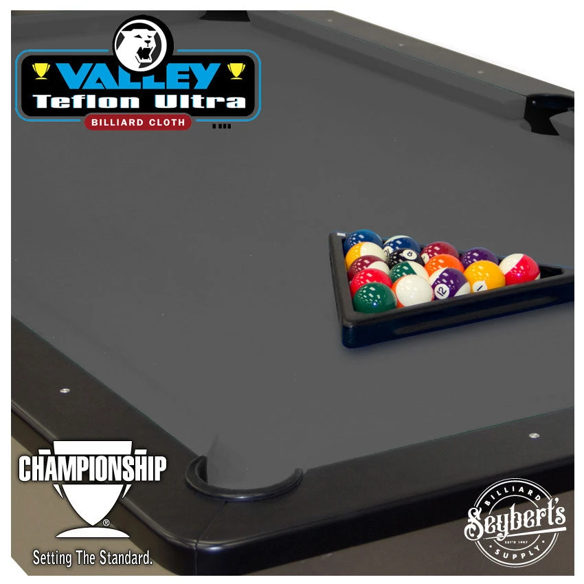 Valley Teflon Ultra  Steel Grey is the same great cloth as the popular Mercury Ultra. The only difference is the Valley Teflon Ultra is bathed in Dupont Teflon before the fabric is weaved creating the only truly liquid-resistant fabric. Teflon Ultra is a 19oz weight woolen fabric that undergoes the same finishing process as the higher-priced worsted cloths. This woolen-hybrid fabric stain-resistant cloth was created for the players who demand the speed, consistency, and true rolls of a worsted cloth but do not want to pay the higher prices that come with it.