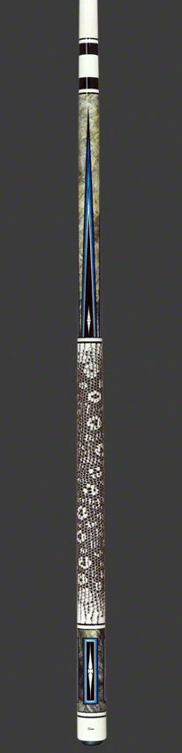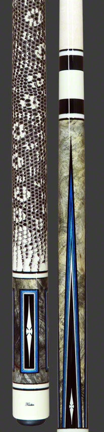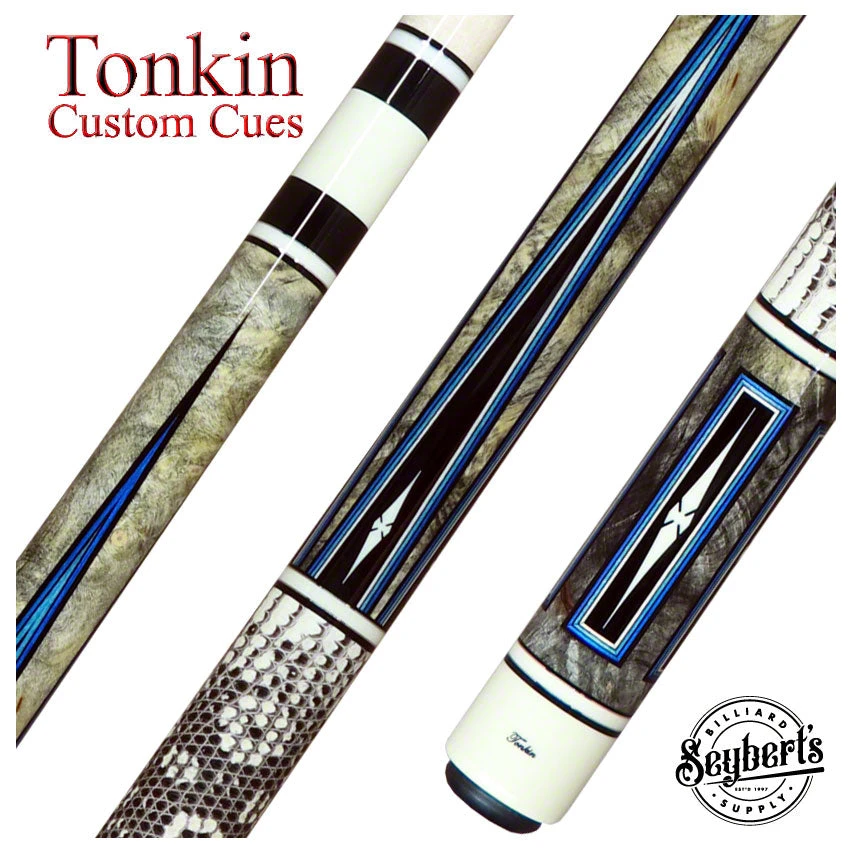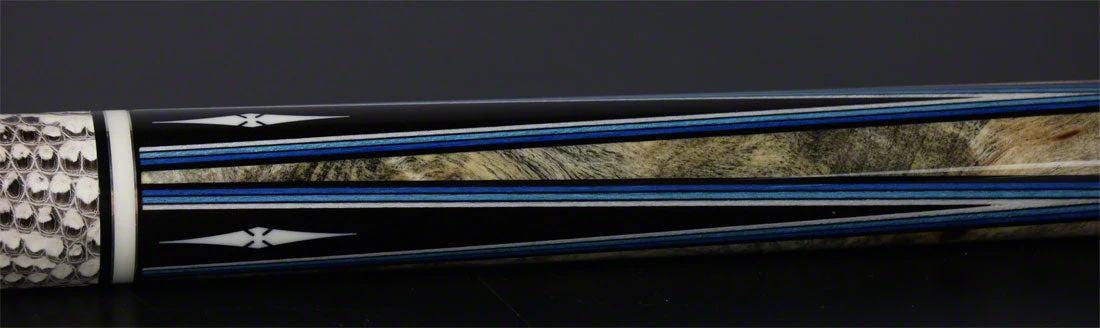 Tonkin Custom 4 Point Burl Pool Cue. Tonkin Cues uses the most intricate and beautiful wood to create these amazing cues. This cue has a burl forearm with four ebony points outlined in blue, teal, and natural veneers and a burl butt sleeve with four floating ebony windows matching the forearm design. Completing the cue are two 13mm maple shafts with aegis short ferrules and a Tonkin Black Soft Tip. Completing this cue is a genuine snakeskin wrap and custom matching ebony joint protectors.
