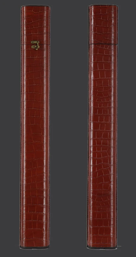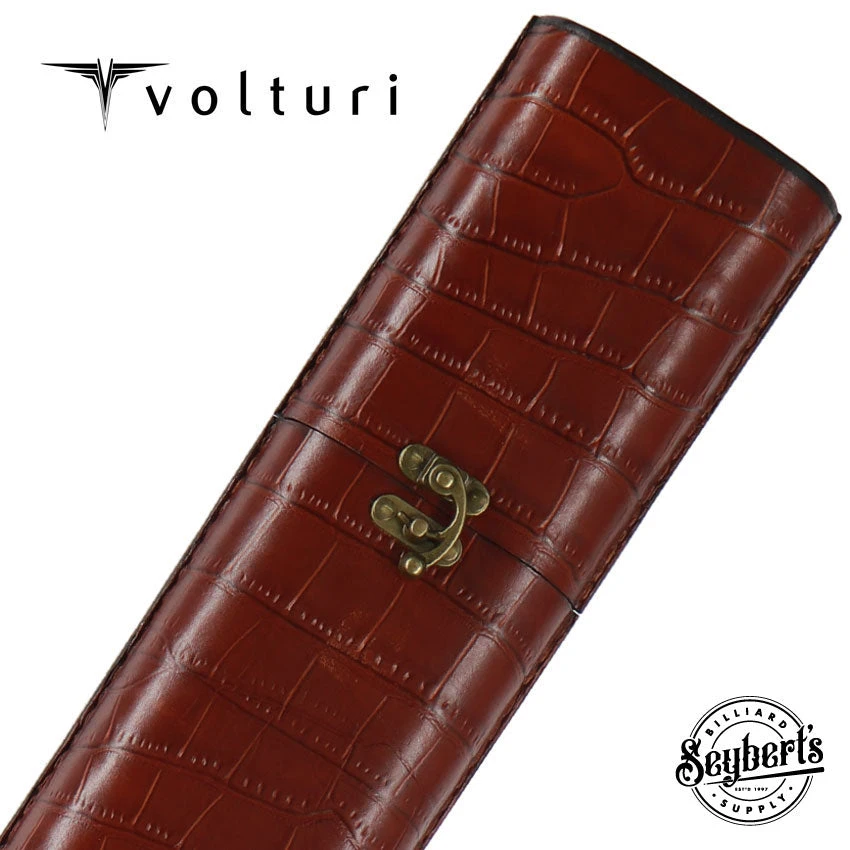 The Volturi Fellini Style 2×2 Custom Cue Case is made of authentic  Saddle Tan Veg-tan crocodile leather hand-crafted to perfection. This Fellini style case has a tight-fitting lid that is compression fit to protect your investment.