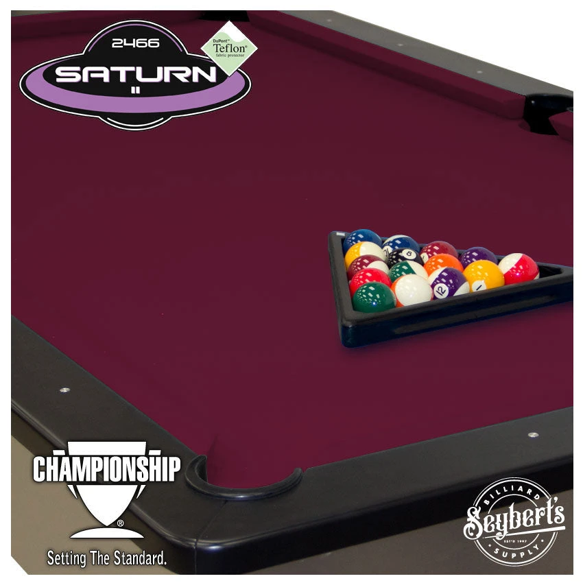 Championship Saturn Wine Pool Table Cloth. Saturn cloth is a premium cloth with  DuPont Teflon coating for added stain protection. A blended wool cloth with a tight weave that provides a smooth ball roll and an unequaled stretch for ease of application. All Championship cloth comes precut with 6 rail clothes as well as the bed cloth including a table spot.